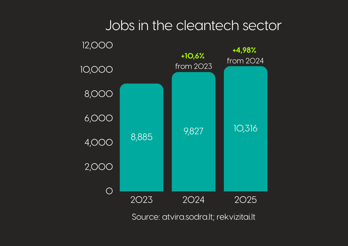 The 2025 data points to a clear direction: Lithuania’s cleantech sector continues to grow, has surpassed the 10,000-jobs mark, and is becoming an increasingly important part of the high-value economy. In 2023, the sector employed 8,885 people; in 2024, 9,827; and in 2025, already 10,316. This means that 1,431 additional jobs were created over two years. Employment grew by 10.6% in 2024 and by a further 4.98% in 2025. The sector is therefore not only expanding, but also demonstrating a steady ability to create new jobs. At the same time, another important trend is becoming visible: the pace of growth slowed in 2025 compared with 2024. This is not a sign of weakening, but rather a signal that part of the market is moving from a phase of faster expansion into a more mature phase of growth.