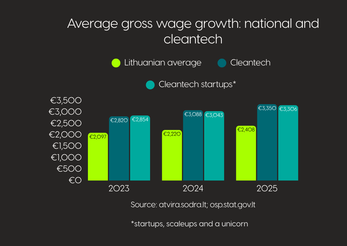 A high wage level is also maintained in the most dynamic part of the ecosystem – the segment of cleantech startups, scaleups, and the unicorn. In this segment, the average gross wage in 2023–2025 was around 37–42% higher than the national average. This shows that even younger and fast-growing cleantech companies in Lithuania are already competing for talent in terms of pay.