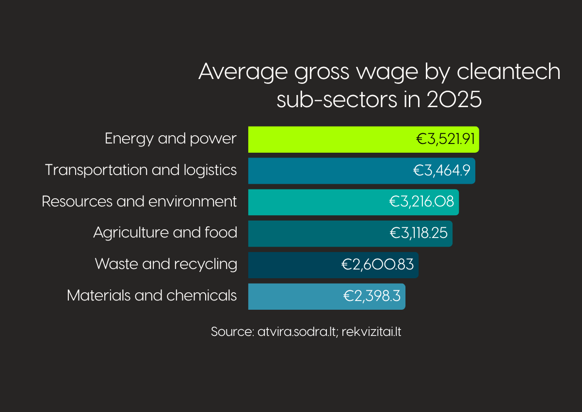 The first 2025 data points provide a fairly clear view of the overall direction: Lithuania’s cleantech sector is growing, creating more jobs, offering wage levels that significantly exceed the national average, and increasingly concentrating in high-value-added activities. This points to a maturing ecosystem in which innovation is more and more often turning into real economic value, while the sector’s weight in the Lithuanian economy continues to grow.