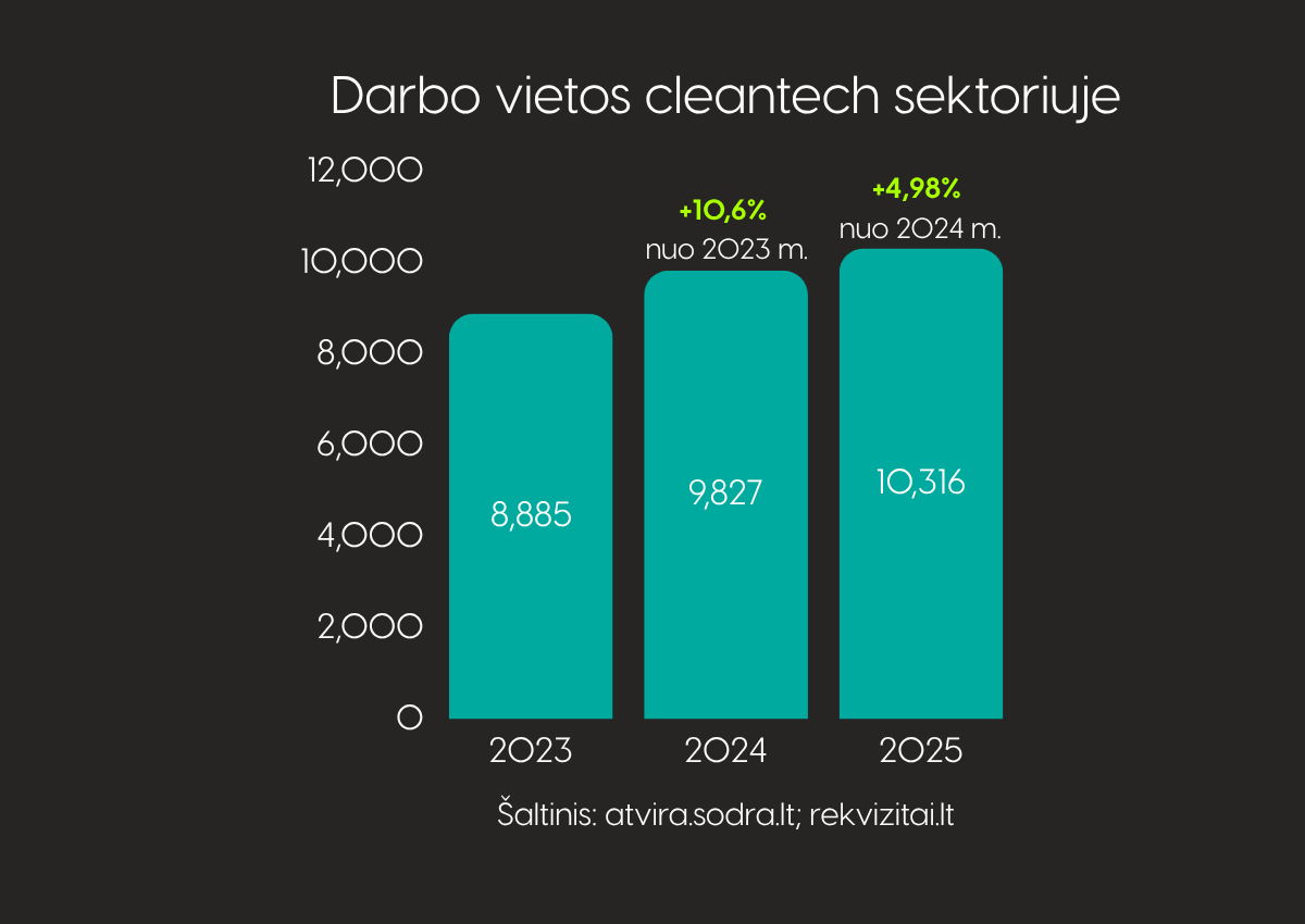 2025 m. duomenys rodo aiškią kryptį: Lietuvos cleantech sektorius toliau auga, peržengė 10 tūkst. darbo vietų ribą ir vis labiau įsitvirtina kaip aukštos pridėtinės vertės ekonomikos dalis. 2023 m. sektoriuje dirbo 8 885 žmonės, 2024 m. – 9 827, o 2025 m. – jau 10 316. Tai reiškia, kad per dvejus metus sektoriuje atsirado 1 431 papildoma darbo vieta. 2024 m. darbuotojų skaičius augo 10,6 %, o 2025 m. – dar 4,98 %. Taigi sektorius ne tik plečiasi, bet ir rodo stabilų gebėjimą kurti naujas darbo vietas. Kartu matyti ir kita svarbi tendencija: 2025 m. augimo tempas sulėtėjo, palyginti su 2024 m. Tai nėra silpnėjimo ženklas, o veikiau signalas, kad dalis rinkos pereina iš spartesnės plėtros etapo į brandesnę augimo fazę.