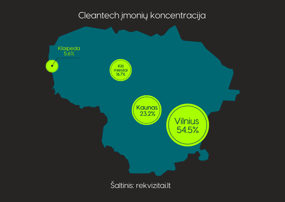 Pagal registracijos vietą Lietuvos cleantech įmonės ir toliau koncentruojasi didžiuosiuose miestuose. Duomenys rodo, kad 54,5 % į šią analizę patekusių cleantech įmonių yra registruotos Vilniuje, 23,2 % – Kaune, 5,6 % – Klaipėdoje, o likusios 16,7 % – kituose miestuose. Tai reiškia, kad daugiau nei trys ketvirtadaliai sektoriaus įmonių telkiasi dviejuose pagrindiniuose centruose – Vilniuje ir Kaune.