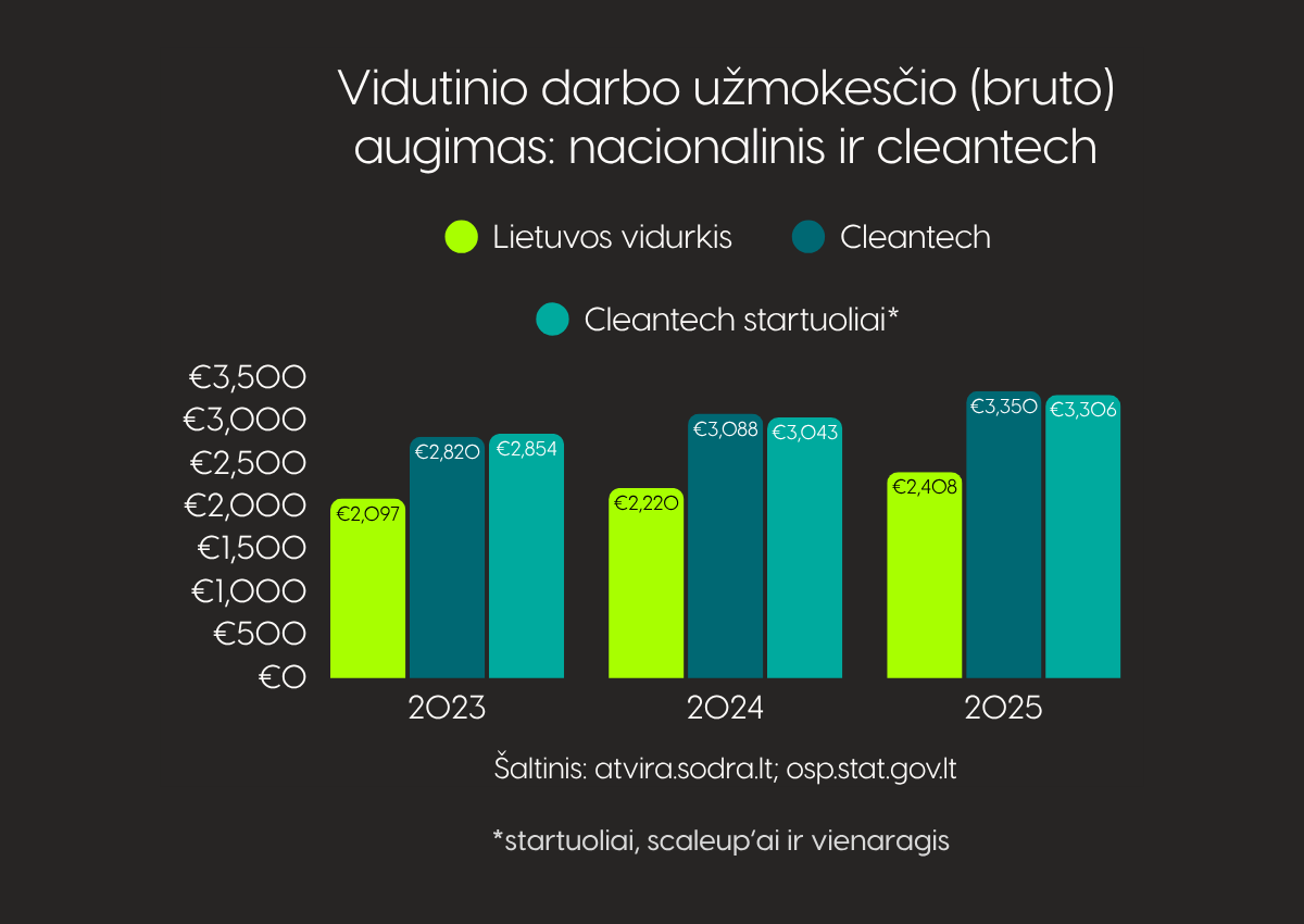 Aukštą atlygio lygį išlaiko ir dinamiškiausia ekosistemos dalis – cleantech startuolių, scaleup’ų ir vienaragio segmentas. Šiame segmente vidutinis bruto darbo užmokestis 2023–2025 m. buvo apie 37–42 % aukštesnis už šalies vidurkį. Tai rodo, kad net ir jaunesnės bei sparčiai augančios cleantech įmonės Lietuvoje jau konkuruoja dėl talentų atlygio prasme.