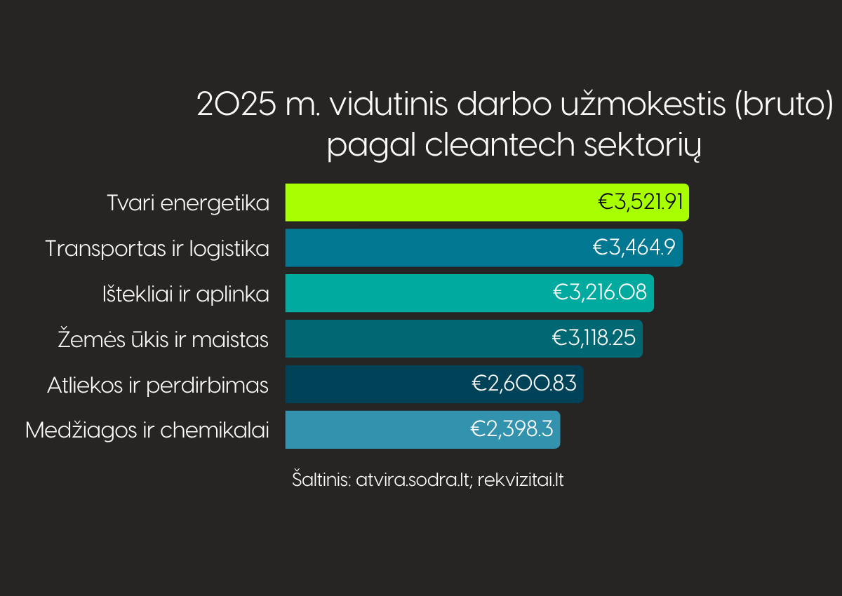 Ne mažiau svarbi ir atlygio dinamika. Vidutinis darbo užmokestis bendrai cleantech sektoriuje 2023–2025 m. nuosekliai augo, o pats sektorius visą laikotarpį išliko aiškiai virš šalies vidurkio. Per šiuos trejus metus cleantech sektoriaus vidutinis bruto darbo užmokestis buvo maždaug 39–40 % didesnis nei bendras Lietuvos vidurkis, o 2025 m. siekė 3 349,93 Eur. Ši dinamika rodo aukštos pridėtinės vertės darbo vietų koncentraciją ir augantį specializuotų kompetencijų poreikį.